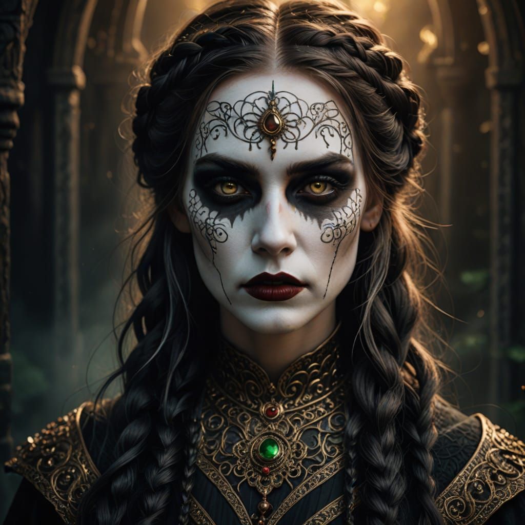This striking portrait captures a woman's enigmatic beauty, with pale skin, dark braided hair, and bold makeup set against a rich gold and brown background. Intense green eyes and dramatic lighting create a captivating, mystical atmosphere.
