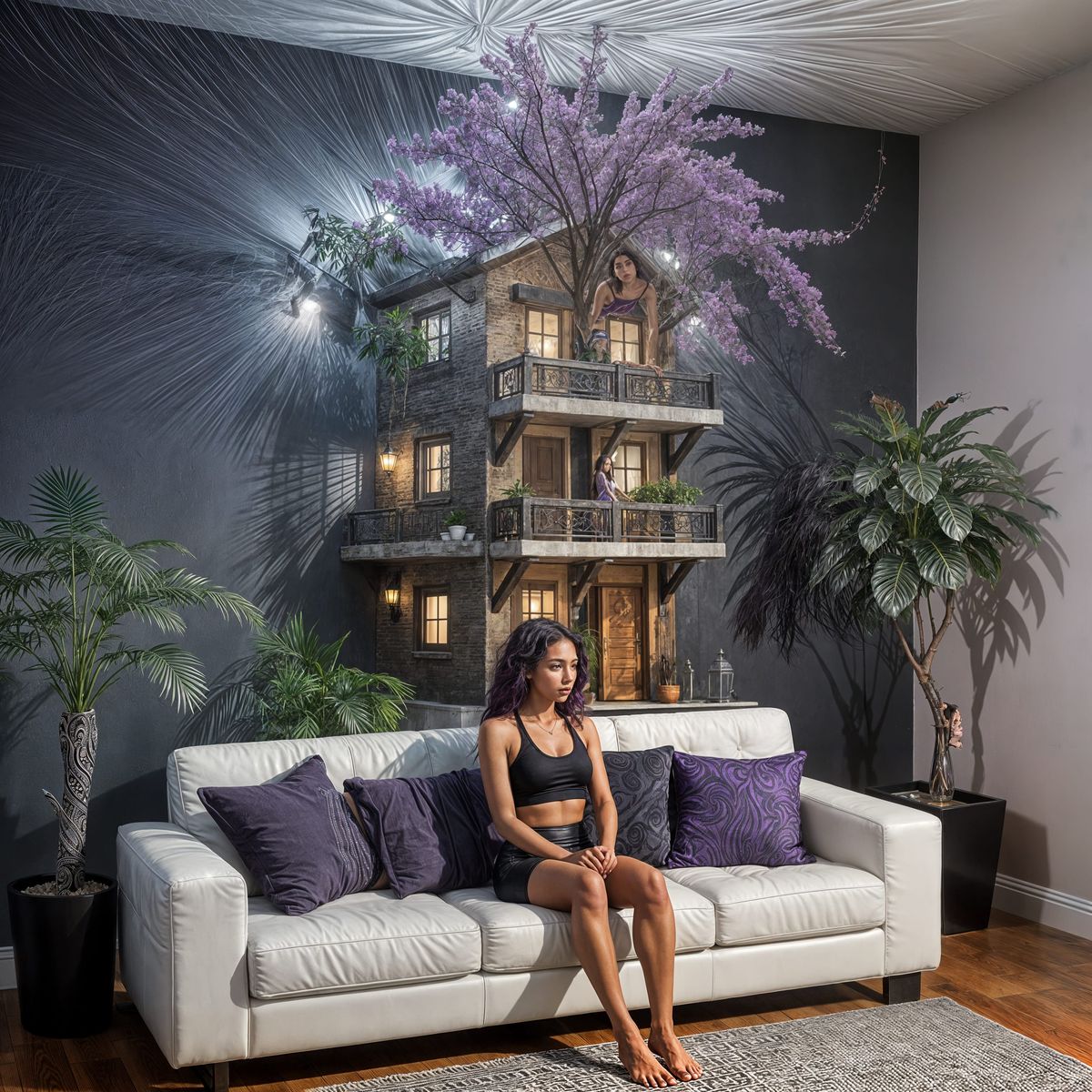 This image shows a young man and woman sitting on a white leather couch in a room with purple walls decorated with silver and black tribal designs. There is a lighted Lego tree house nearby, rendered in a dreamlike style.