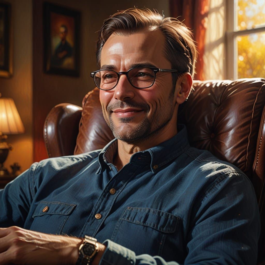 My latest attempt to capture an image of me in a portrait. This is to be used as my avatar. If one uses their imagination well, you can see me in this portrait. My last one was more realistic. It just had too much fluffed up hair on the head, way too much facial hair and too slender looking. But other than that, it was me. This new portrait makes me look too good looking and too mature looking. So, this portrait is kind of me (the glasses and the receding hairline). Thank you for letting me indulge myself ๐.