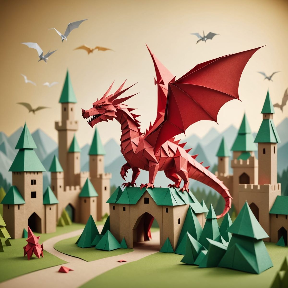 This image shows a detailed origami fantasy scene. A paper dragon is attacking a paper castle, depicted with intricate paper folds and stationery elements, rendered in soft focus.
