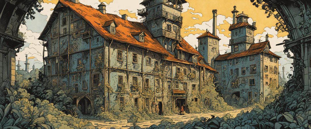 This image shows an abandoned factory covered in graffiti and overgrown with exotic plants, bathed in warm, golden light. Rendered in a retro comic book style with vibrant colors and bold lines.