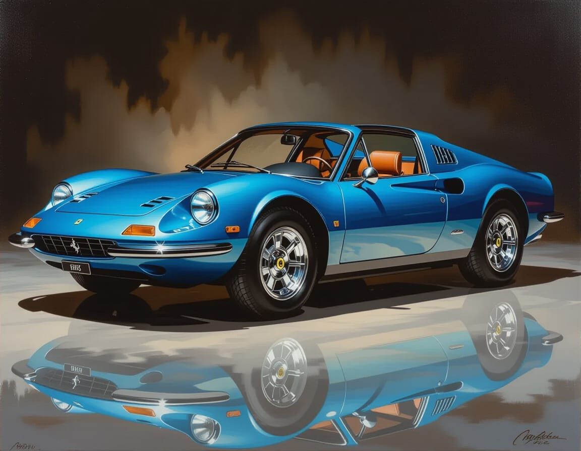 A hyperrealistic painting of a metallic blue 1972 Ferrari Dino 246 GTS with chrome wheels, featuring dramatic lighting and intricate detail in a classic art style.