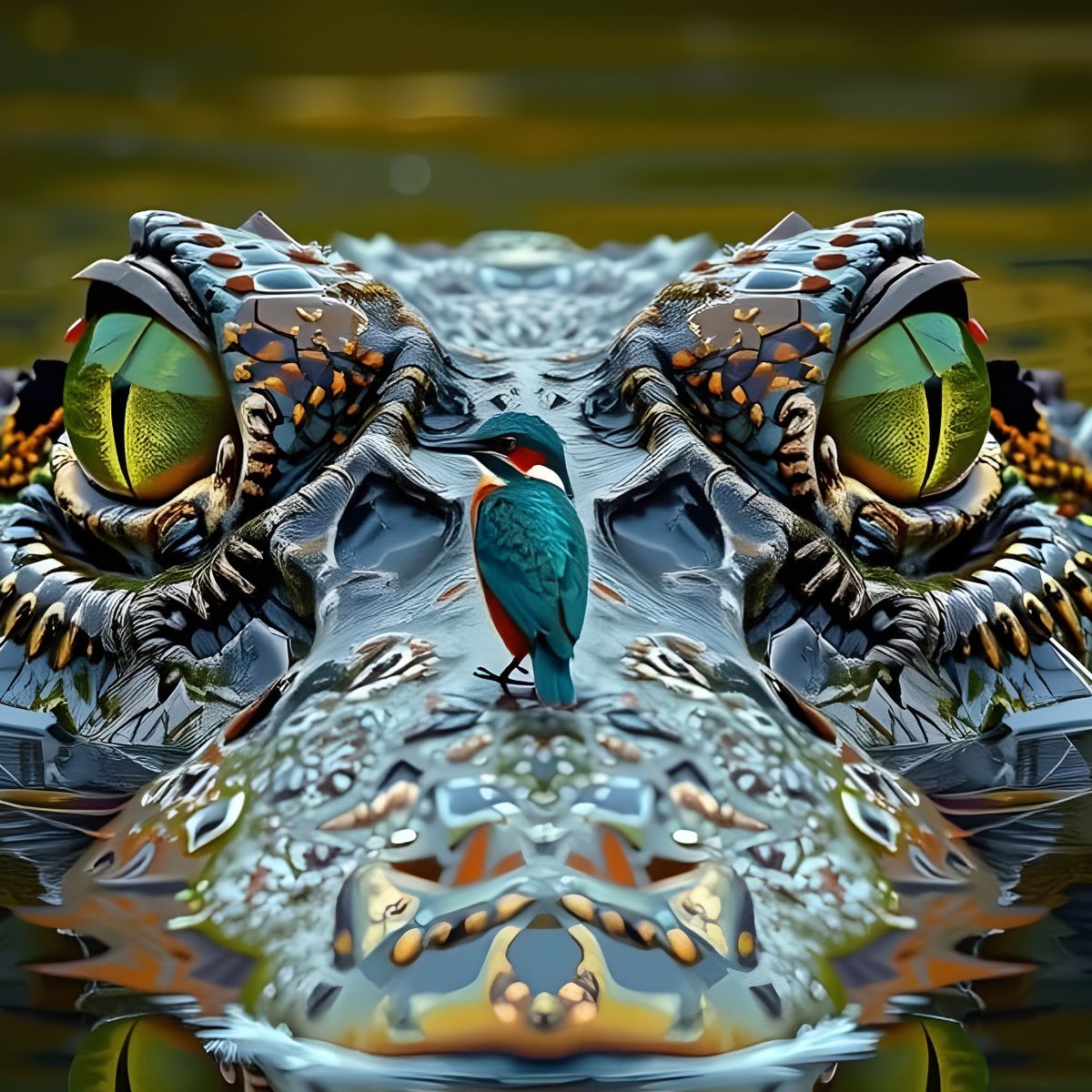 This image depicts a serene yet ominous scene of a kingfisher perched on a crocodile's nose, set against the tranquil backdrop of an African river. The crocodile's piercing emerald green eyes seem to hold a deep wisdom, while the kingfisher's presence adds a touch of whimsy to the otherwise foreboding at...