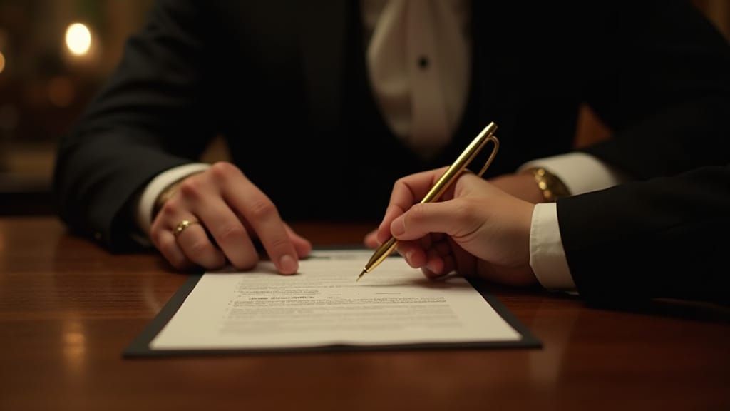 A close-up of a woman's hand holding a pen, poised over a contract, in a dimly lit, luxurious mafia office with a handsome boss watching from the shadows, evoking a cinematic atmosphere with warm lighting and film grain.