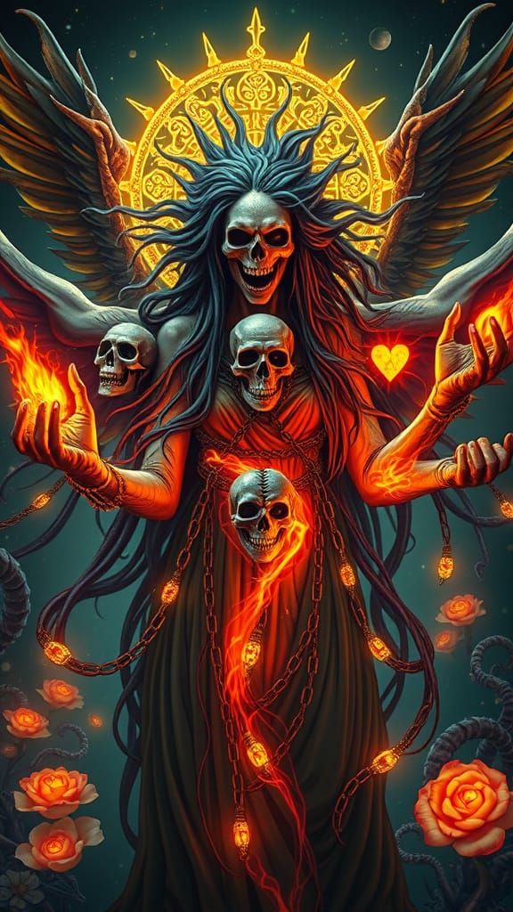 This image depicts a screaming goddess with six radiant arms and transforming hair. Her fiery wings and surreal objects create a dark divinity aesthetic.