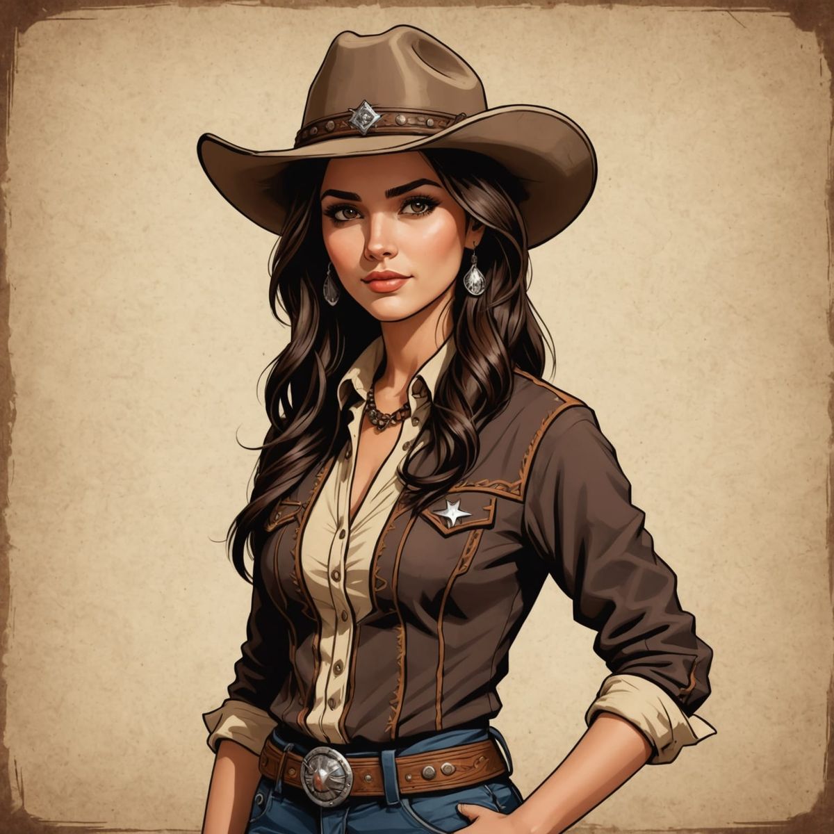 This fun and creative cartoon showcases a beautiful young woman with dark hair and brown eyes, dressed in western wear and a cowboy hat. A stylized illustration against a simple backdrop.