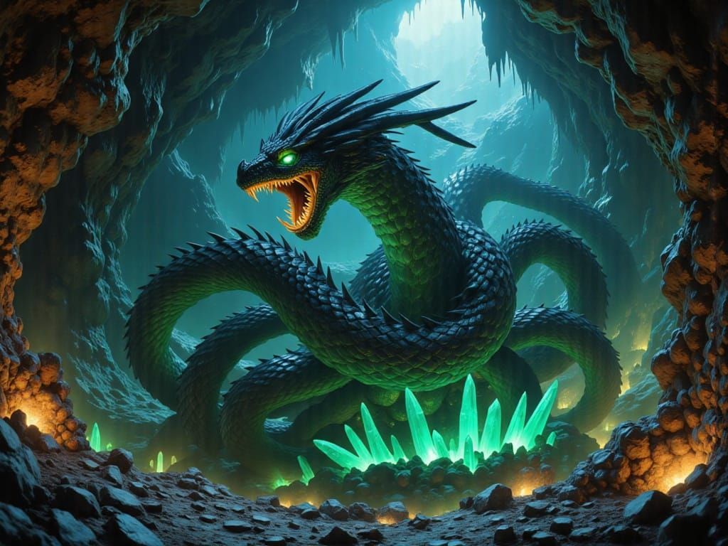 This image shows a photorealistic dragon with obsidian and emerald scales guarding a cavern of glowing crystals and artifacts. Cinematic lighting and wide-angle lens create a fantasy epic feel.