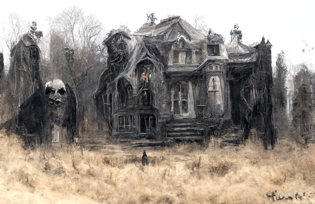 A sinister, gothic-cyberpunk image of a haunted Victorian house. The style evokes classic horror illustration with a dark fantasy aesthetic, reminiscent of Addams Family or Psycho.