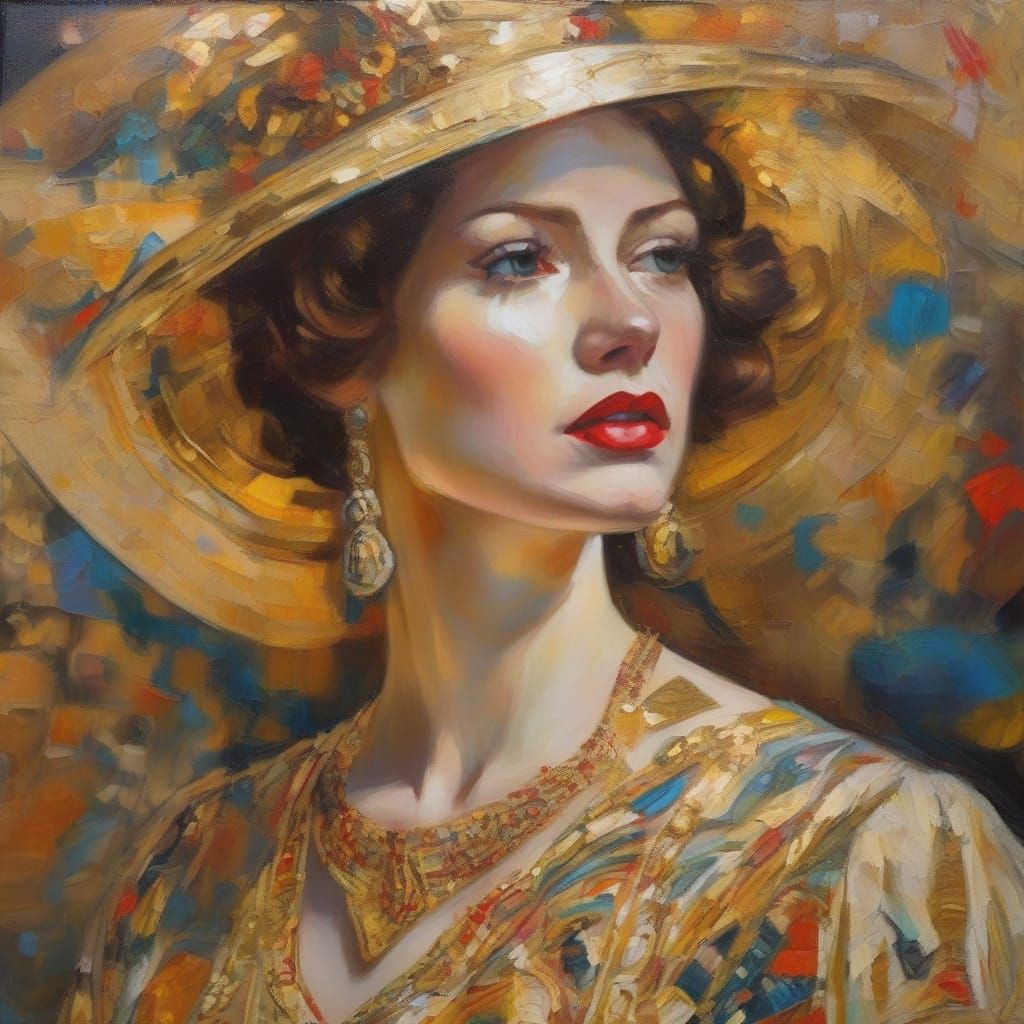 This image shows a lady in ornate art deco clothing. The close-up oil painting features thick, textured brushstrokes and vibrant geometric patterns, with golden lighting and luxurious colors.