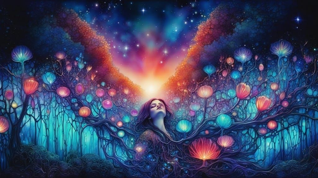 This hyperrealistic digital painting features a surreal portrait of a woman in an art nouveau style. Bioluminescent flowers entwine her hair, set against dramatic, cinematic lighting with a bokeh effect.