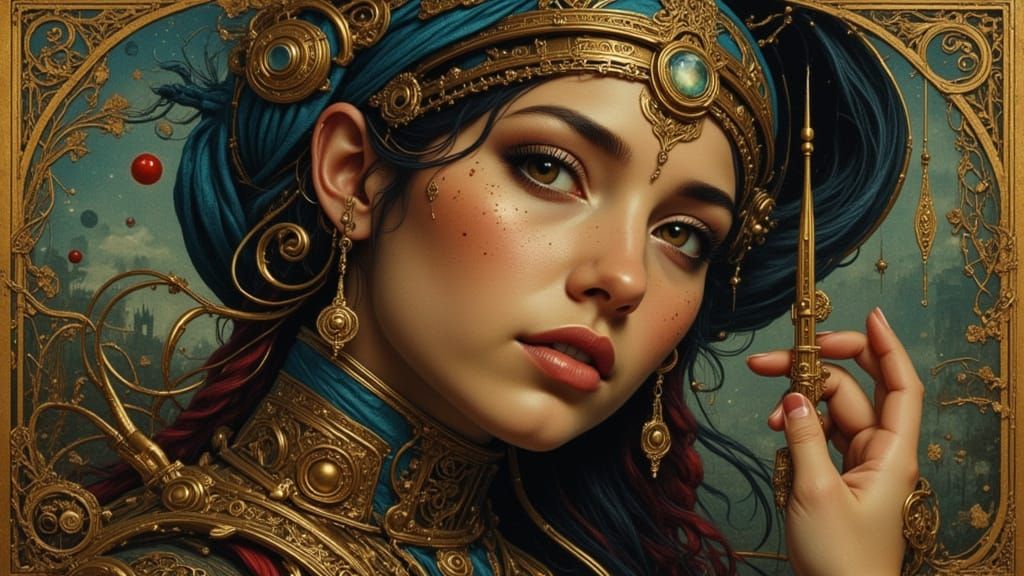 This hyperdetailed concept art showcases a head and shoulders portrait of old-world technology. Featuring dynamic lighting and triadic colors, it's rendered in a splash art style.