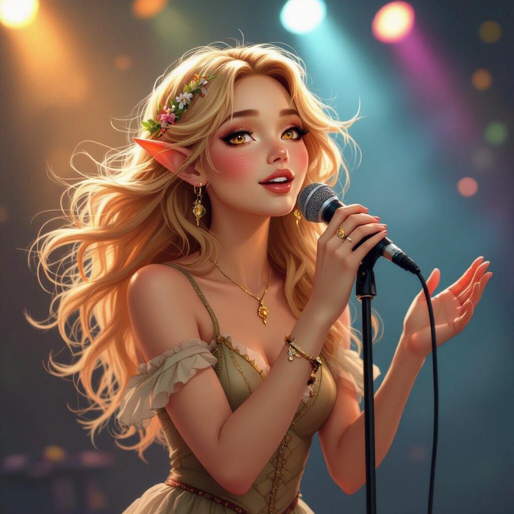 A striking image of a tan-skinned elf with amber eyes singing on stage. Her strawberry blonde hair flows in the wind, illuminated by colorful stage lights, in a whimsical, mystical art style.