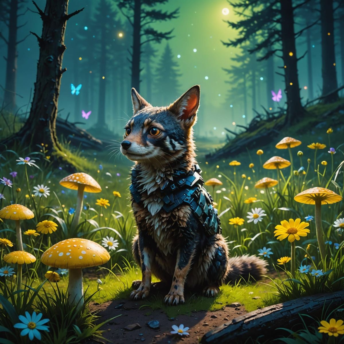 A vibrant image showing woodland animals gathering in a field as night falls, observed by a wizard. The scene has a cyberpunk aesthetic with neon accents.