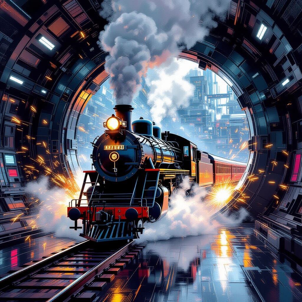 This image shows a vintage steam train emerging from a portal into a futuristic space station. Sparks and steam fill the scene, set against metallic surfaces and neon lights, in an impressionistic style.