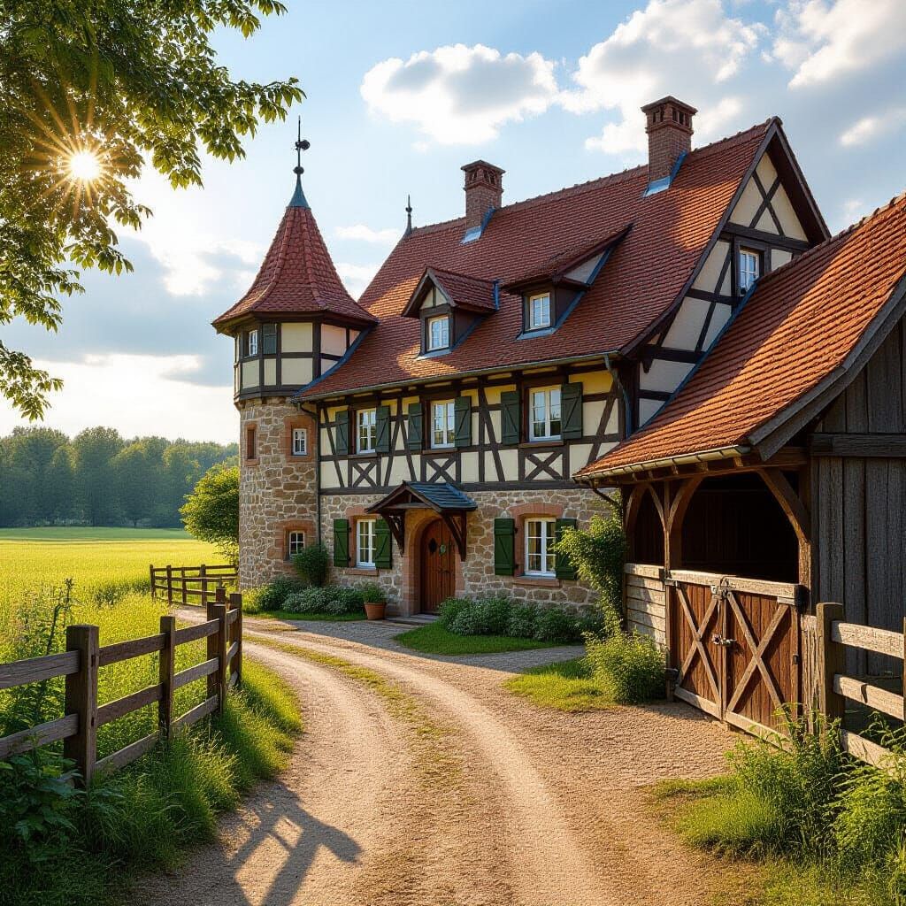 This image shows a medieval manor house situated in a quaint German village. Lush fields surround the timber-framed structure, enhanced by warm sunlight and realistic depth of field.