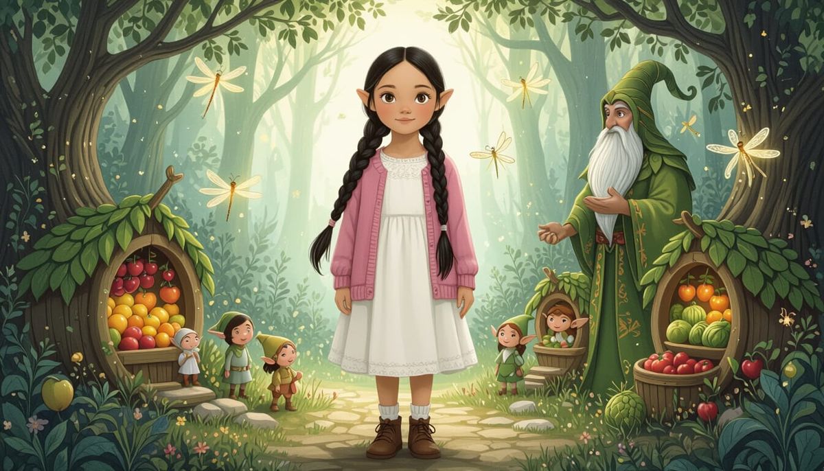 This image shows a young girl in a forest filled with tiny, elf-like creatures and glowing dragonflies. The whimsical style features intricate details and soft, ethereal lighting.