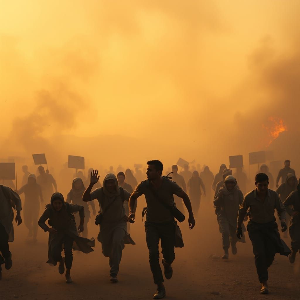 This image shows a dramatic scene of people fleeing a massive fire, surrounded by smoke and flames, with a shimmering oasis in the distance, evoking a sense of hope in a cinematic style