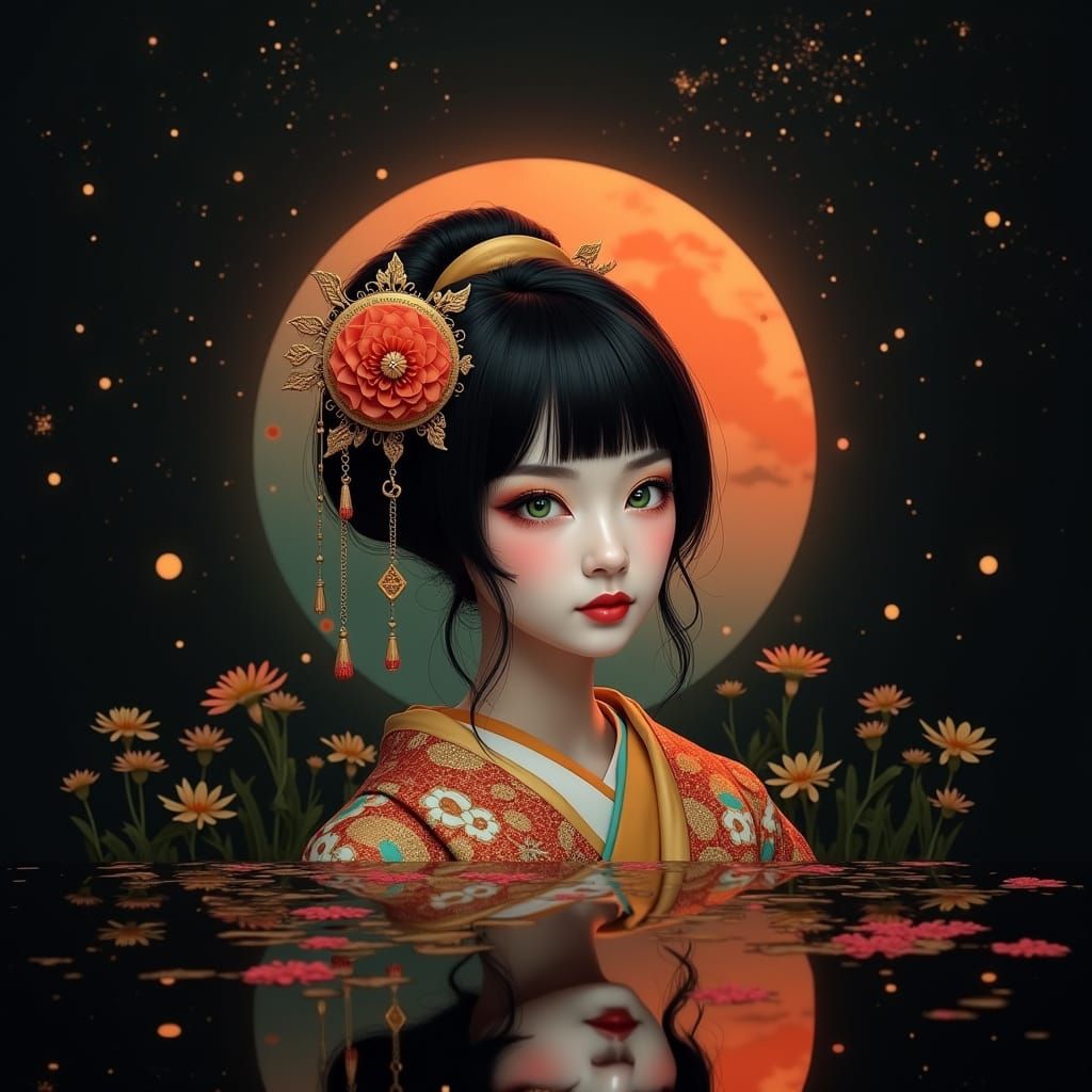 A hyperrealistic portrait of a geisha with black hair and green eyes. She wears an orange, red, yellow, lilac, white, and green dress and is touching a mirrored reflection in a cosmic setting.