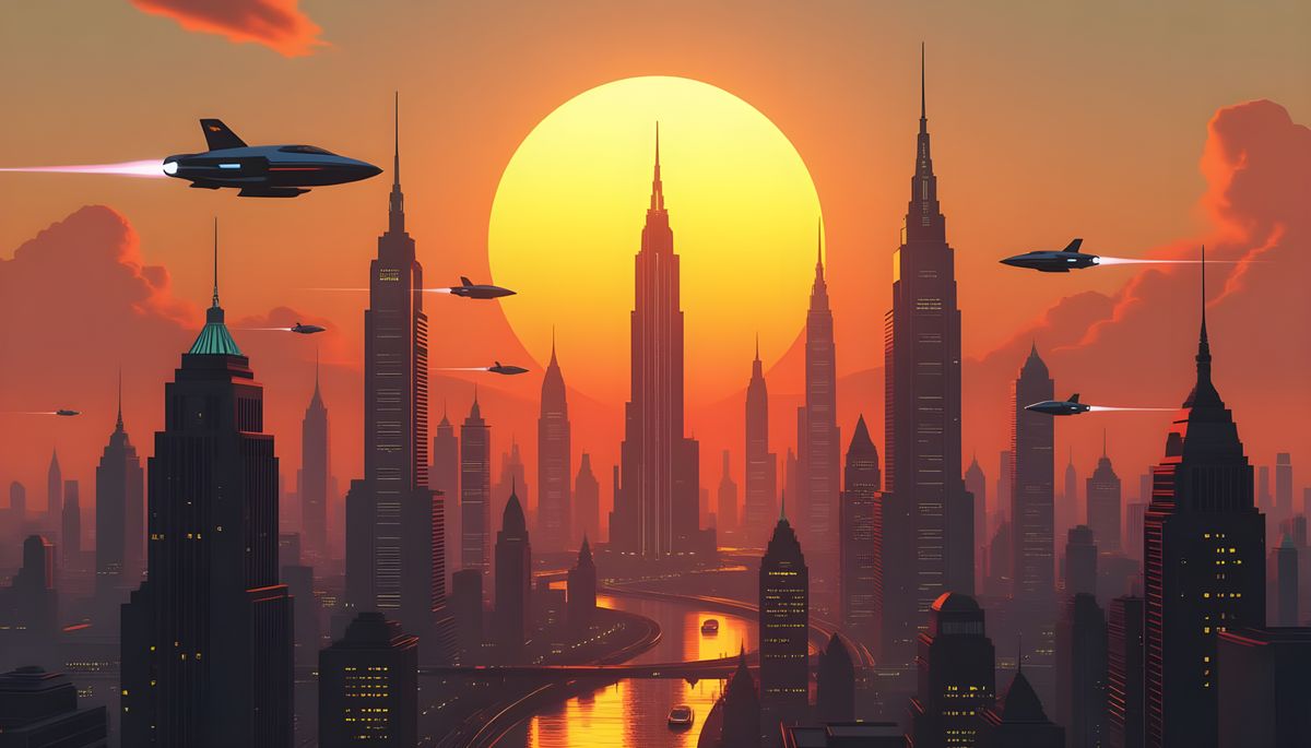 This image depicts a retro-futuristic city skyline illuminated by a brilliant orange sun rising in the background, casting a vibrant glow over the entire urban landscape.