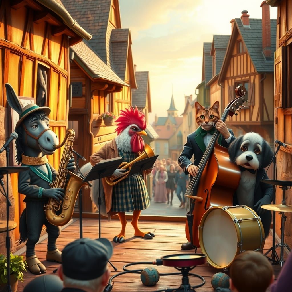 This image shows a jazz band composed of four animal friends playing on an outdoor stage in a medieval town. The scene is bathed in the warm light of the golden hour, reminiscent of storybook illustrations.