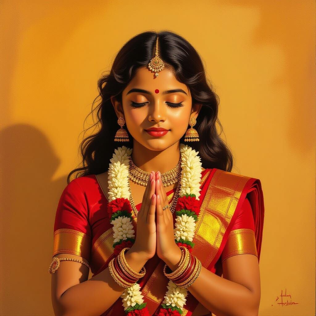 This image depicts an Indian girl in traditional clothing, hands clasped in prayer with a serene expression. The scene features deep shadows and soft lighting, evoking classical Indian art styles.