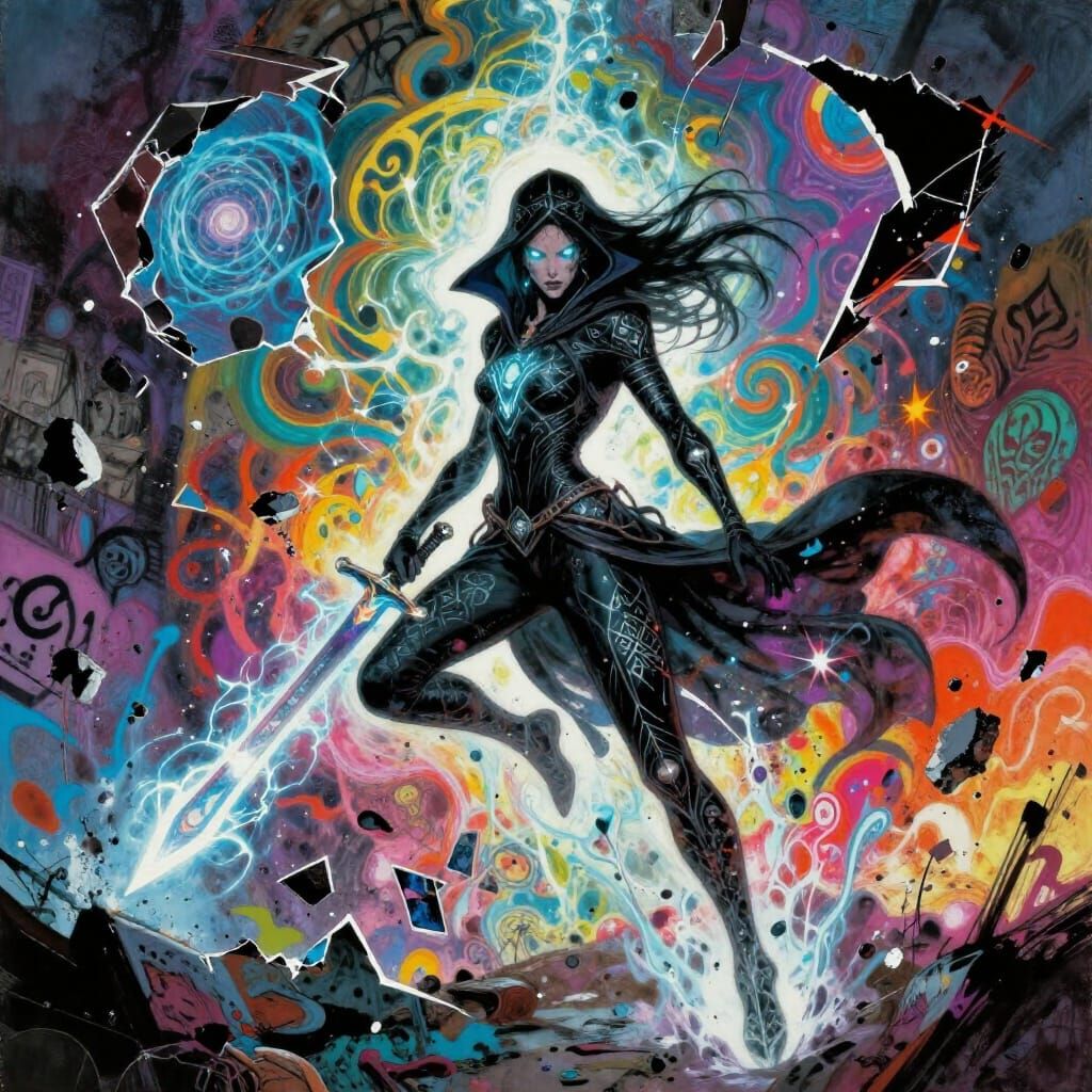 This image shows a cloaked rogue mid-teleport, half-formed in a fractured portal with a glowing cosmic blade. The scene features multicolored energy, swirling chaos, and fractal energy in a highly detailed, cinematic fantasy style.