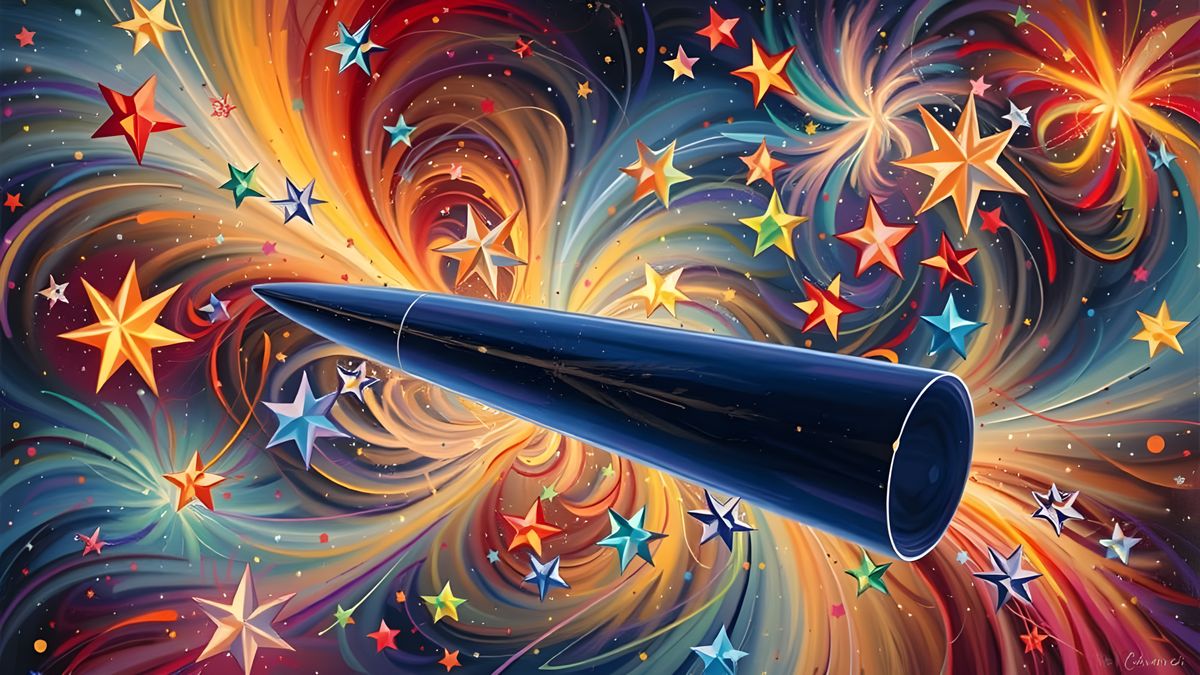 A mesmerizing image of swirling, reflective cylinders amidst a vibrant, textured vortex. The abstract expressionist background features a dynamic interplay of colors and cosmic star patterns as impasto oil painting.