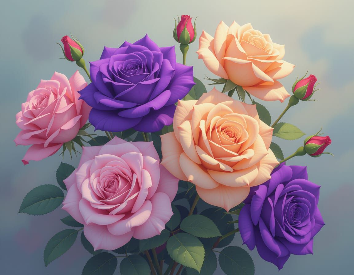 This image showcases ultrarealistic roses in vibrant shades of purple, pink, and orange, creating a visually stunning floral arrangement.