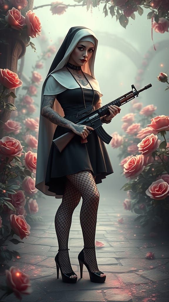A photorealistic image of a goth nun with tattoos holding an AK-47 in a rose garden. The nun wears fishnets and high heels, and is illuminated by soft, ethereal lighting, in a mystical aesthetic.