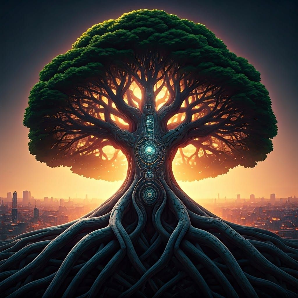A striking picture of a futuristic tree with glowing roots, its bark replaced with circuitry, set against a sprawling sci-fi cityscape at dusk. The image is rendered in a cinematic style.