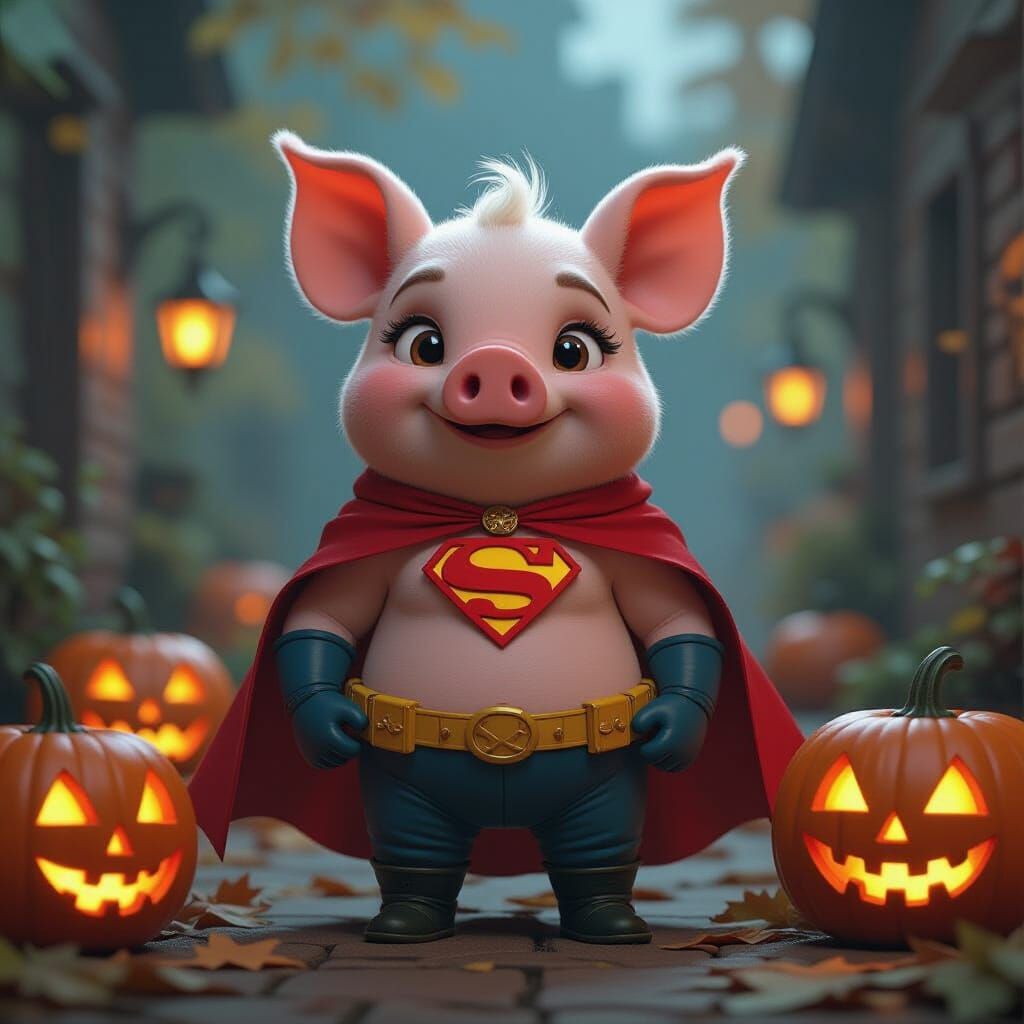 This image shows an anthropomorphic pig superhero in a cape at a Halloween party. Features include pumpkin decorations and jack-o-lanterns, rendered in a detailed matte painting style with deep, complementary colors.