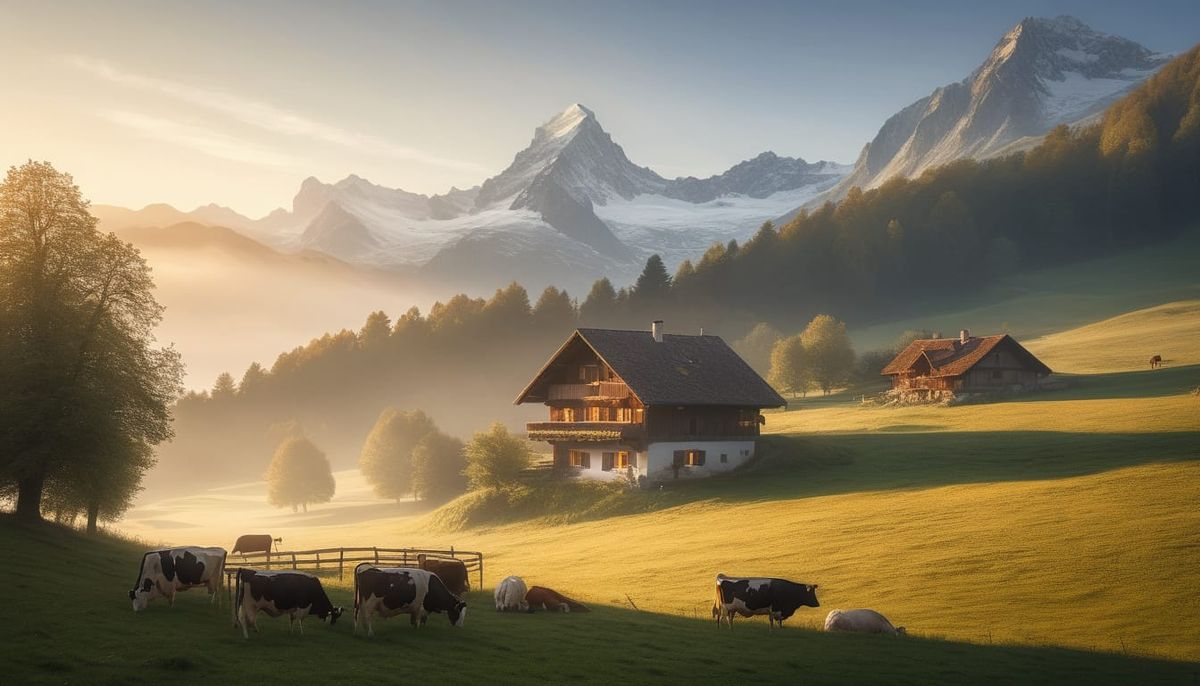This image captures a romantic chalet nestled in lower pastures with grazing cows, bathed in golden hour light. It features hyperdetailed mist and a soft glow, creating a tranquil and idyllic pastoral scene.