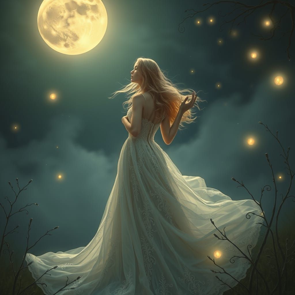 This enchanting image depicts a beautiful blonde woman in a flowing, mystical gown, chasing the promise of dawn amidst a soft, luminescent aura, surrounded by delicate vines and fireflies, in a dreamy, fantasy art style.