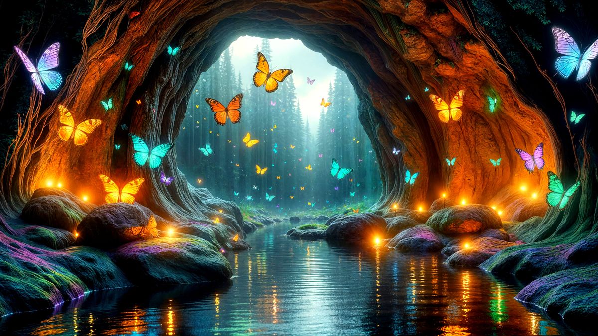 This image shows a serene and highly detailed nighttime grotto scene filled with colorful butterflies, featuring iridescent wings in a triadic color palette with deep blues and purples, and polished photorealistic details.