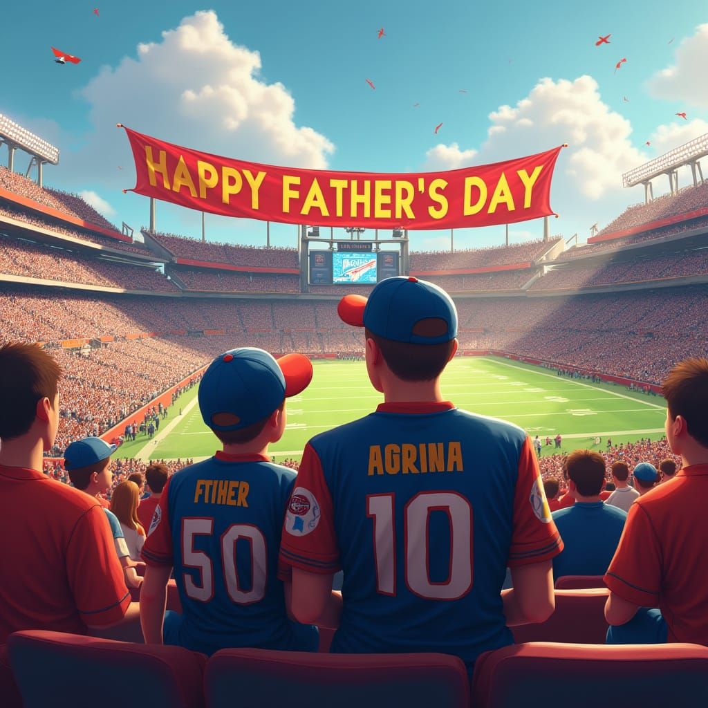 A vivid image of a father and son in matching jerseys at a bustling football stadium, celebrating Father's Day. A large banner reads 'Happy Father's Day' in the style of digital art.