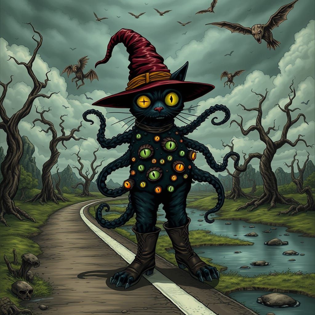 This image shows a tentacled, octopoid-cat hybrid with a smoke-like body and many colored eyes. The creature, in a witch's hat and boots, walks through a swampy landscape under a cloudy sky as bizarre comic art.