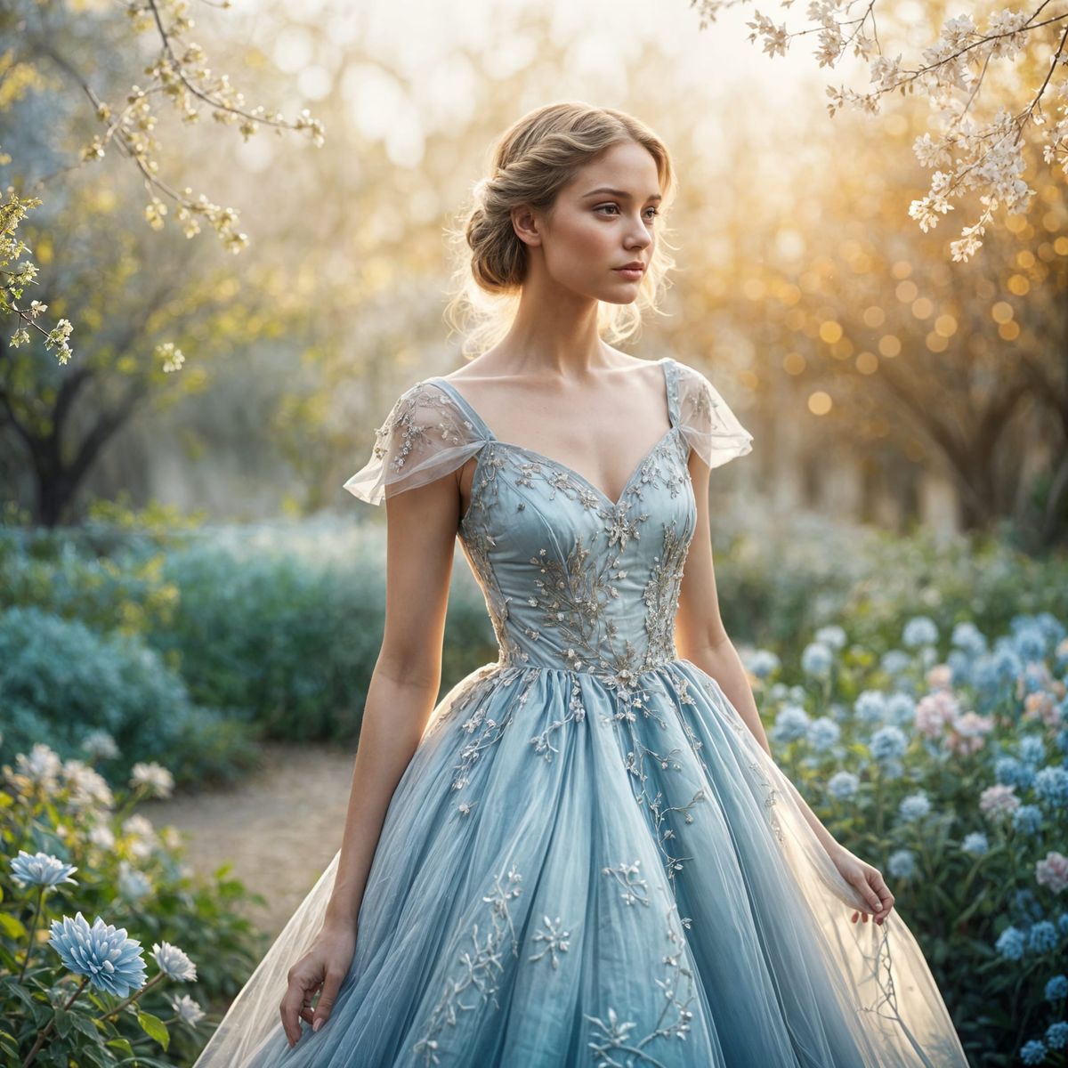 Romantic fairytale illustration. Medium shot. A young woman stands in a garden. Soft focus. Whimsical watercolor style. Delicate petal-like gown details. Icy blue mist sparkling on bodice. Warm golden light with soft pastel colors. Gentle bokeh, high-quality, dreamy, ethereal, soft lighting, elegant, intricate, detailed, enchanting.