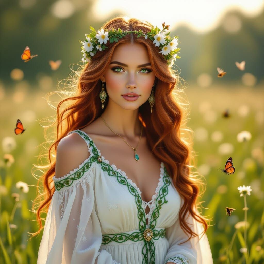 This image shows a Celtic priestess in a sunlit meadow. She has auburn hair, wears a wildflower crown and a flowing white gown embroidered with Celtic knots, in a hyperrealistic style.