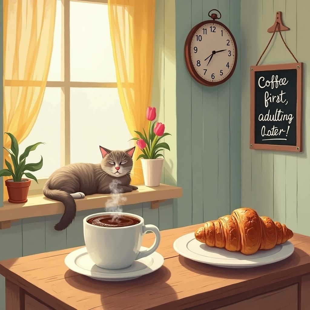 This image shows a cozy kitchen scene with warm sunlight. A cup of coffee and a croissant sit on a rustic table, with a cat napping on a windowsill. The style is reminiscent of a watercolor painting.