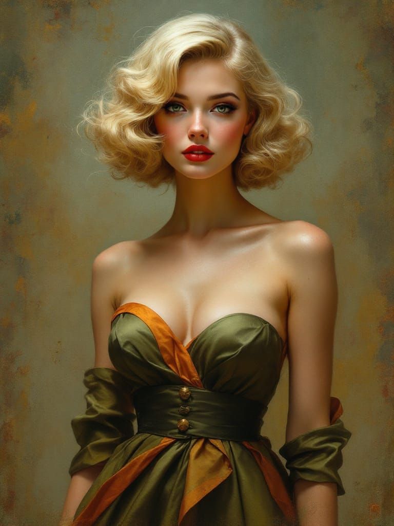 This image shows a full-body view of a 1950s pin-up woman in a green and orange satin dress, with an atmospheric, textured background. Rendered in oil painting style.