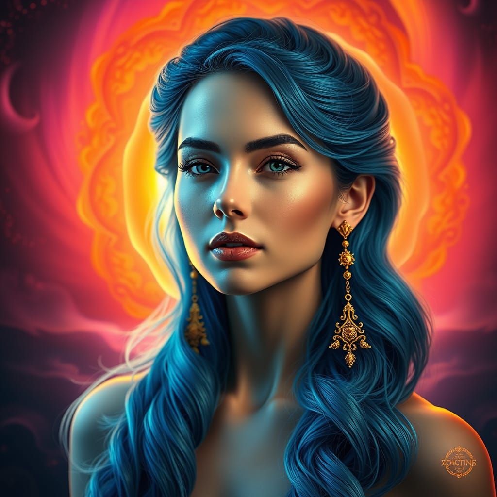 This image shows a stunning, hyper-realistic digital portrait of a beautiful woman surrounded by a vibrant, glowing aura and intricate, futuristic patterns. Her serene face and enigmatic smile are set against a swirling background of orange and pink hues, evoking a sense of mystical energy and wonder.