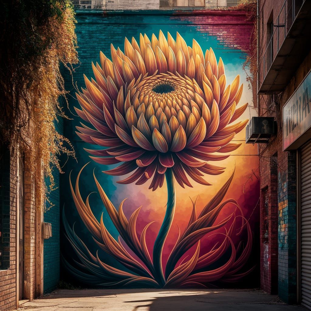 This image shows a vibrant mural on a brick wall in a sunlit alley. The artwork, reminiscent of 80s designs, features a giant flower in shimmering golds, oranges, and crimsons, like a cinematic display.