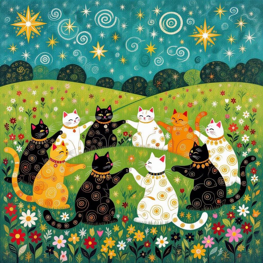 A whimsical scene of cats dancing in a circle, inspired by Gustav Klimt's opulent style. Features green meadows, flowers, colorful snow, and a starry sky with golden accents.