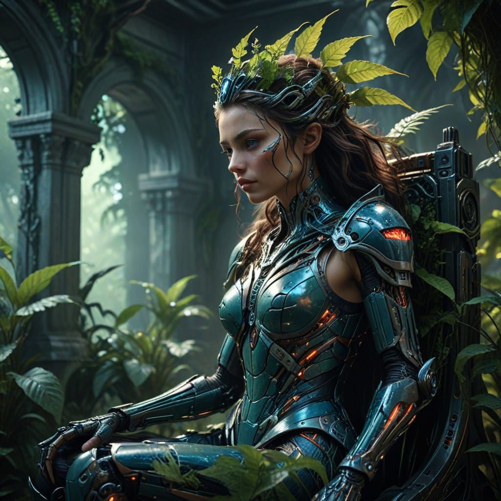 A hyperrealistic digital painting of a biomechanical queen on an overgrown throne. Nature and technology merge with glowing flora and metallic elements in dramatic, cinematic lighting.