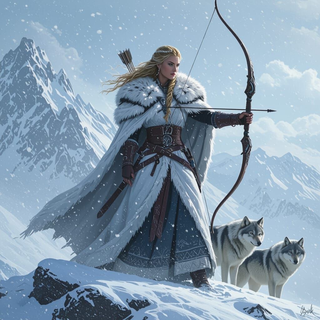 This image shows Skadi, the Norse goddess of winter, on a snowy mountain peak. Wolves accompany her as icy winds blow. The image has a cinematic, ultra-realistic arctic fantasy aesthetic.