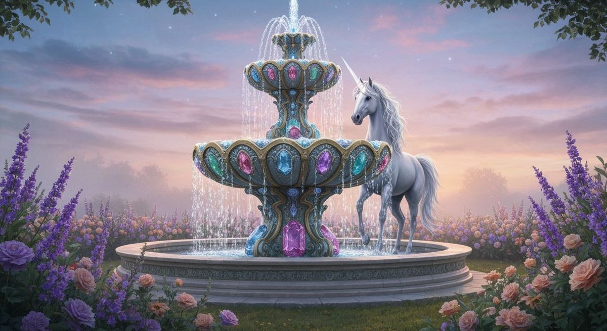 A detailed image shows a unicorn by a jeweled fountain. The scene includes summer flowers in purple, pink, and peach, set against a misty sunset sky. The artwork is reminiscent of an intricate oil painting.
