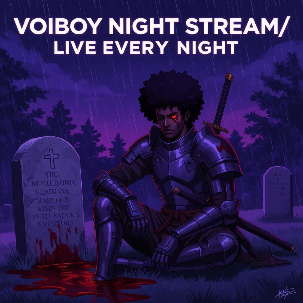 This dark fantasy concept art shows a 20-year-old Black Finn the Human with an Afro, scarred and with a robot arm, sitting by a grave in a blood rain. Rendered with dramatic brushwork and atmospheric environments.
