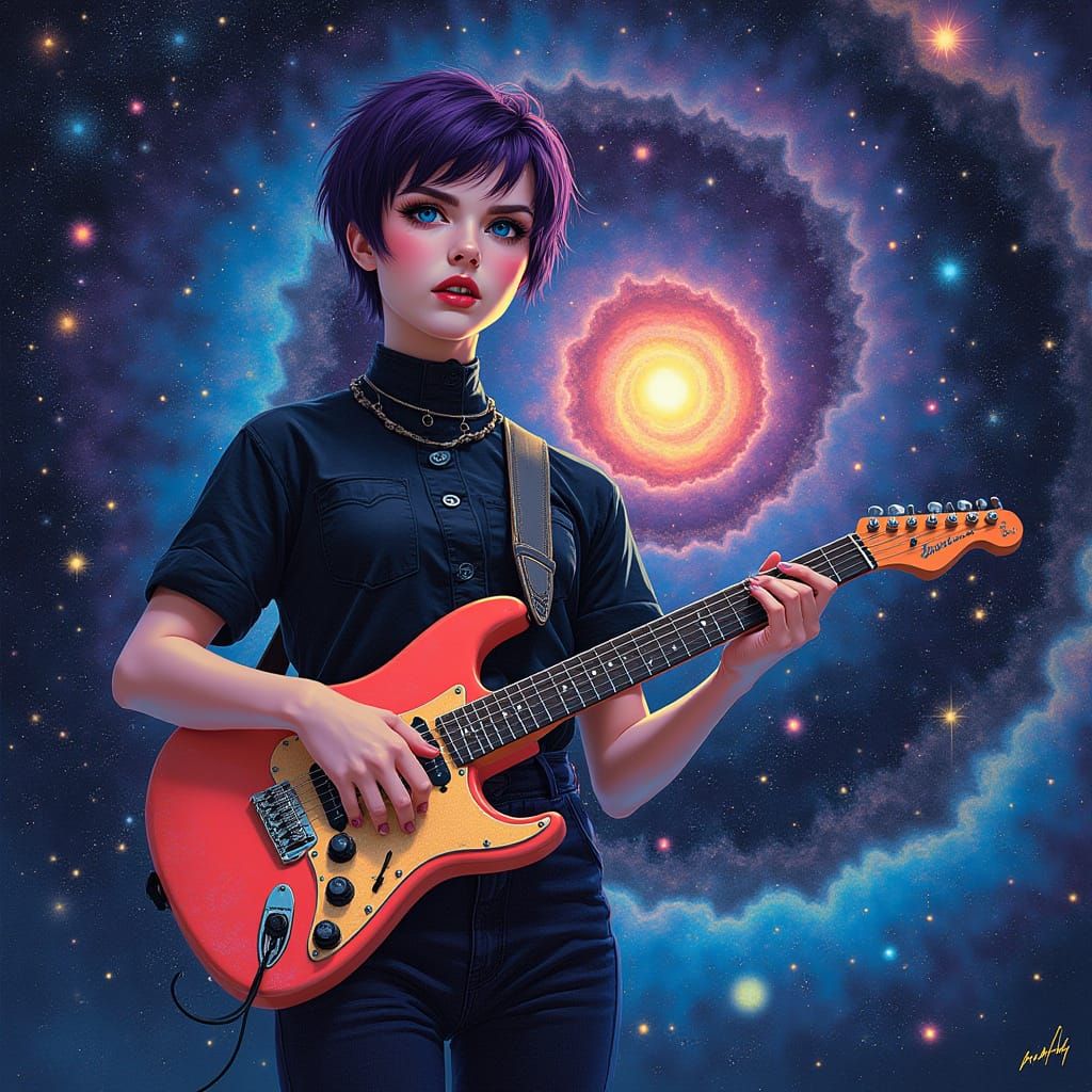 A striking picture of a young woman playing guitar among stars and galaxies. The image blends spiritual symbolism with bioluminescent patterns in a neon-lit futuristic style.