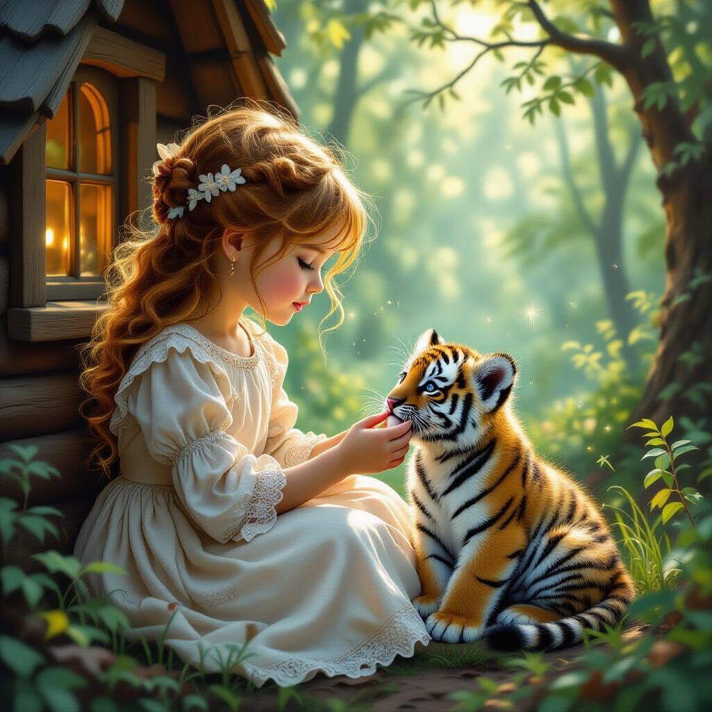 A striking picture of a young Victorian girl with auburn hair, sitting next to a cabin in an enchanted forest. She gently pets a baby tiger cub in this detailed matte painting.