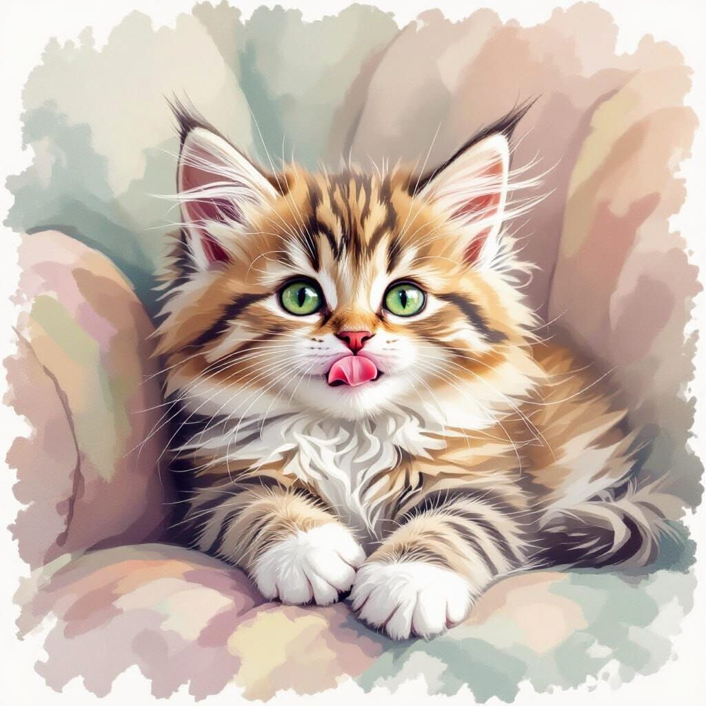 This image shows a fluffy kitten with big green eyes adorably sticking its tongue out. The serene scene is rendered with soft watercolor textures and pastel colors, creating a nostalgic and whimsical feel.
